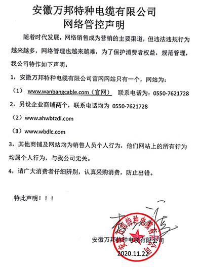鄭重聲明:安徽萬邦特種電纜有限公司官方網站為:www_wanbangcable_com.sdbjkj.cn,除此之外無任何子網站或合作網站,其余均為假冒偽劣。電話:0550-7621728 13485756353 地 址:安徽省天長市滁州高新技術產業開發區經四路29號